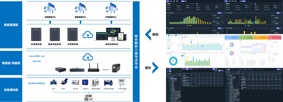 建设基于标识解析的能耗管理平台,将每台能耗采集设备注册标识并接入管理平台,自动采集能耗数据并存储,采集数据通过标识注册的方式录入标识解析系统,实现互联互通,能耗数据统一管理