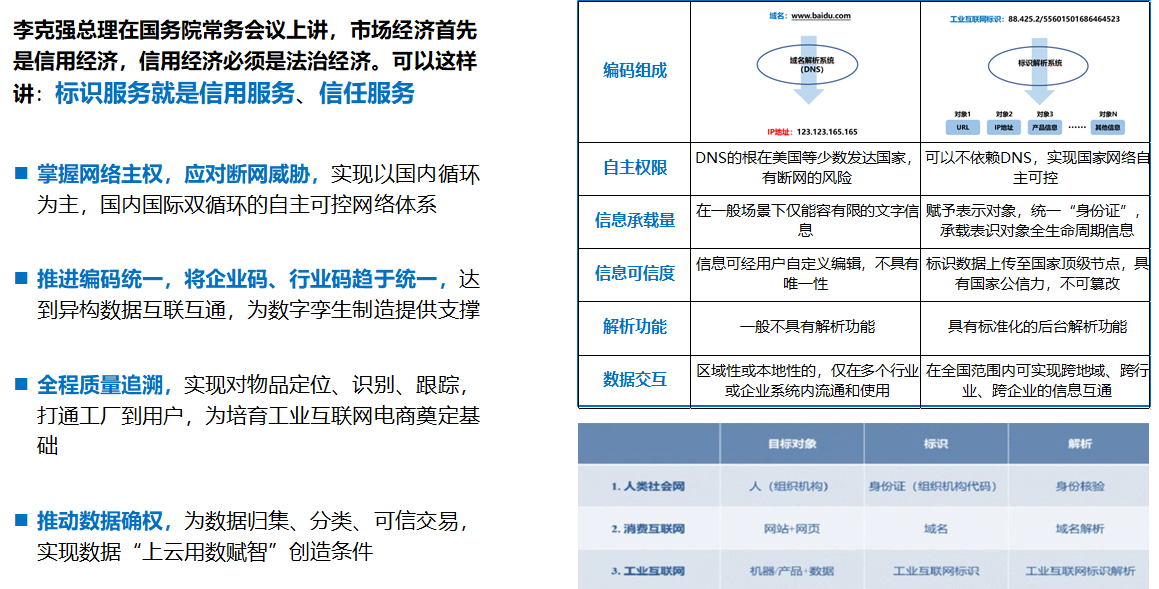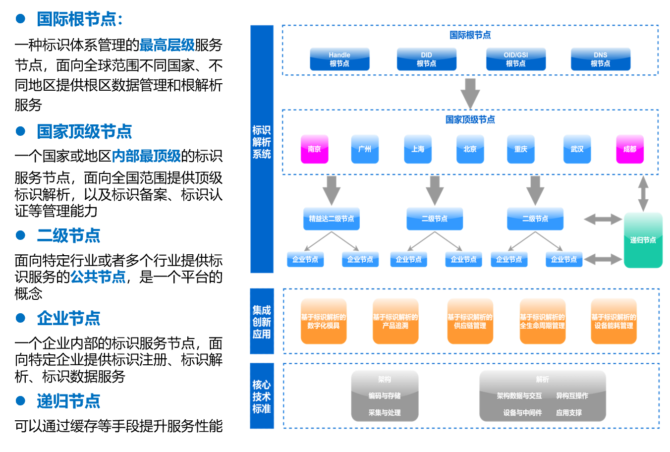 2017年11月,国务院印发了《关于深化“互联网+先进制造业”发展工业互联网的指导意见》,提出要“推进标识解析体系建设。加强工业互联网标识解析体系顶层设计,制定整体架构,明确发展目标、路线图和时间表。设立国家工业互联网标识解析管理机构,构建标识解析服务体系,支持各级标识解析节点和公共递归解析节点建设,利用标识实现全球供应链系统和企业生产系统间精准对接,以及跨企业、跨地区、跨行业的产品全生命周期管理,促进信息资源集成共享。”