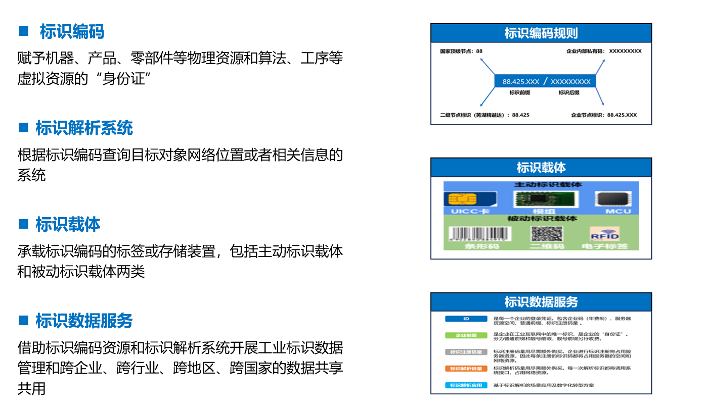 工业互联网标识解析体系核心包括:标识编码、标识解析系统、标识载体、标识数据服务。
