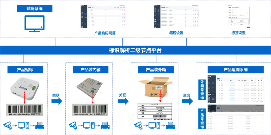 利用标识解析技术和工具,通过一维条码、二维码或RFID标签等方式对单个产品赋予“身份证”,实现一物一码,对产品的生产、扫描装箱、物流、分销等环节进行数据采集跟踪,实现产品生产环节、销售环节、流通环节、服务环节的逐一往下全面监控管理。